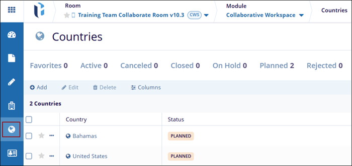 - From the left-hand navigation menu, select the Countries modal.