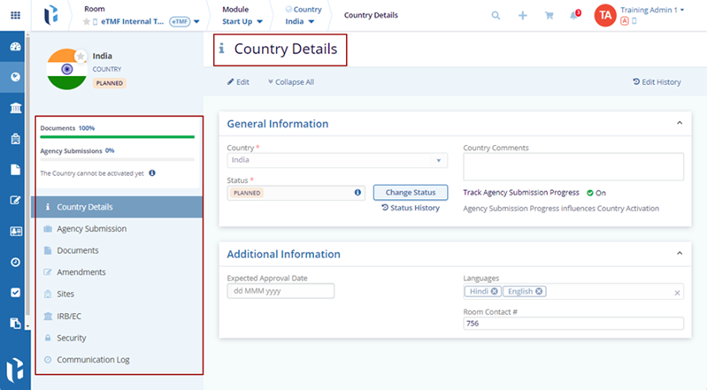 The Country Details page displays a progress bar for - the Documents and the Agency Submission. Below the progress bar, the page displays the tabs/links for Agency Submission, Documents, Amendments, Sites, IRB/EC, Security, and Communication log. Refer to the screenshot below.