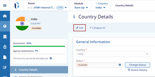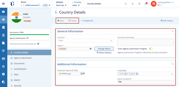 - Edit - Edit fields in General Information and Additional Information for the Country.