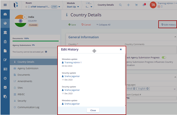 A Status History button is displayed below the Change Status button. Click the button to view the name of the user who made the changes on the Country Details page.