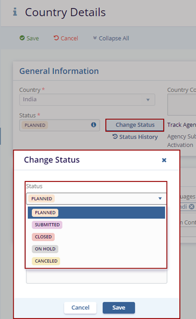 - Click the Change Status button displayed on the Country Details page. This opens the Change Status popup window.