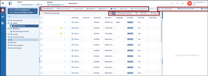 The top menu ribbon provides quick access to tools, that include Placeholder, Add Document, Reconcile, Set Not Applicable, Export, Assign, Document Cart, Layout, etc.