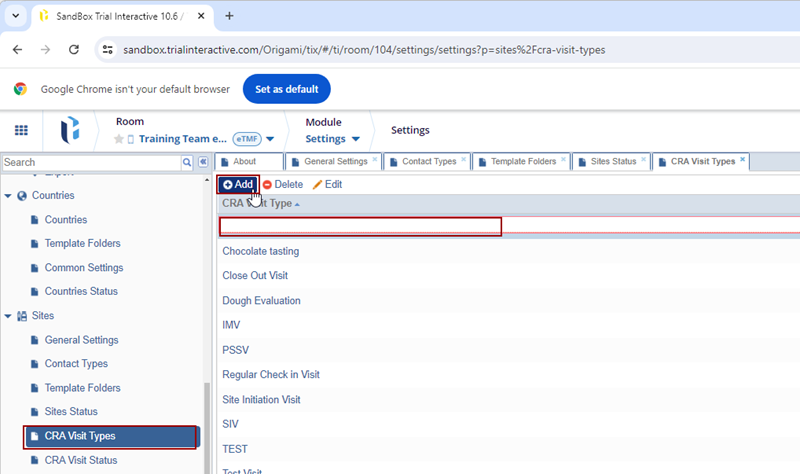 - Click Add, the CRA Visit Type field gets enabled. Enter the name and hit Enter.