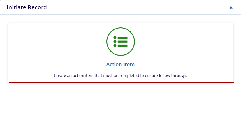 - On the ‘Initiate Record’ modal window, select the Action Item option.