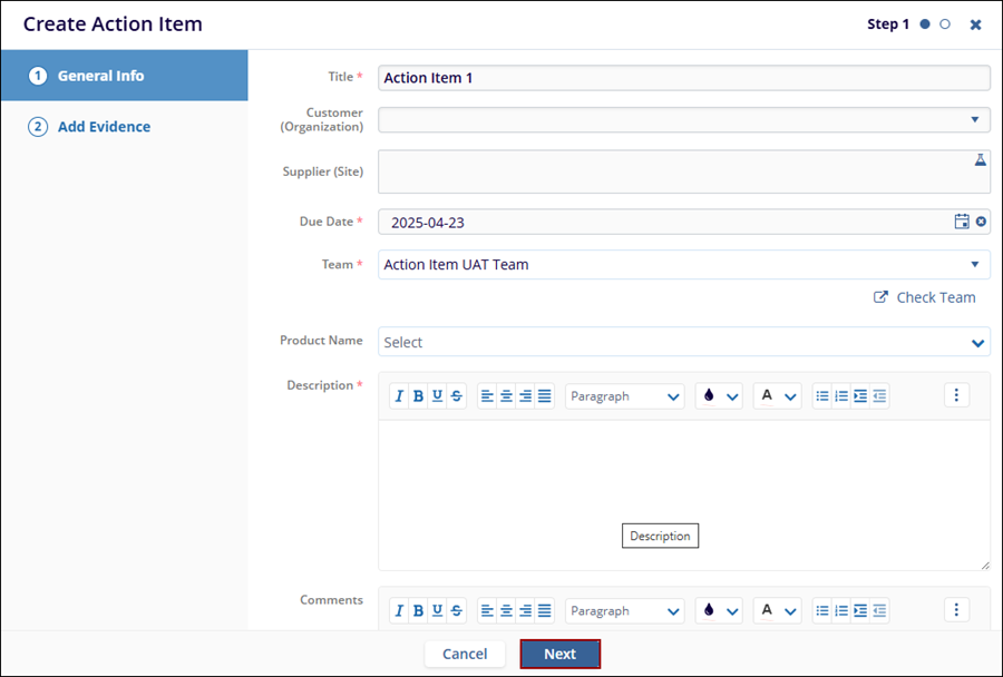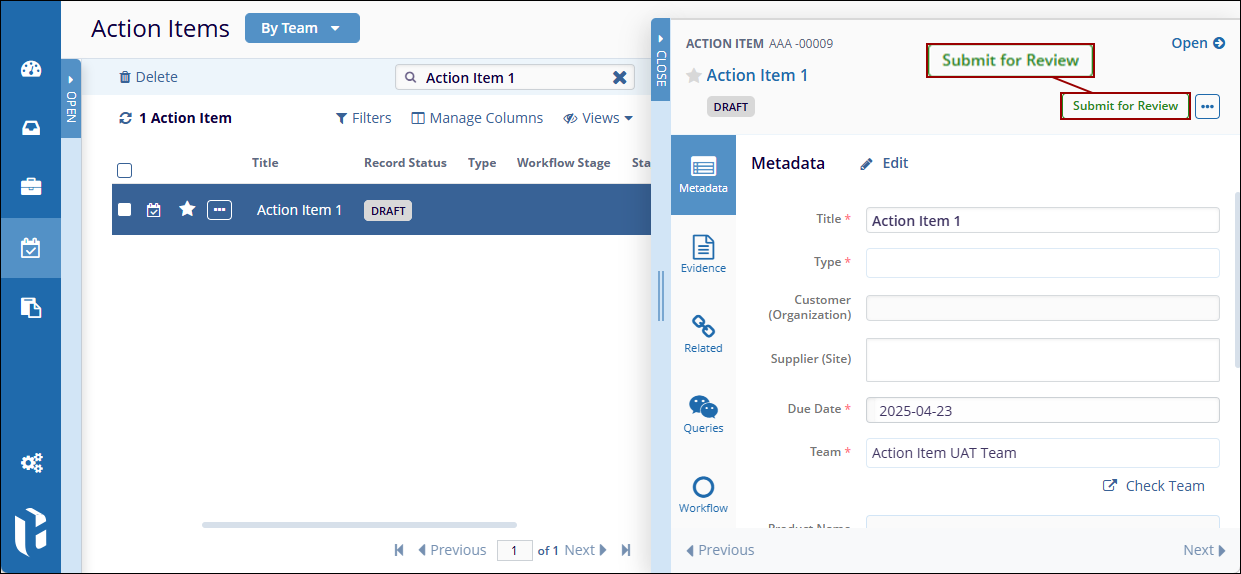 Note: Additionally, the originator must be an Admin user. If the Action item is being created by an editor user, they must belong to the assigned team and hold the necessary authority.