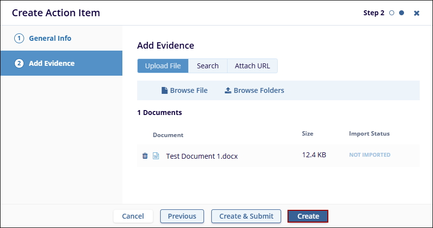 - Within Step 2: Add Evidence, upload a file or folder as evidence and click on the