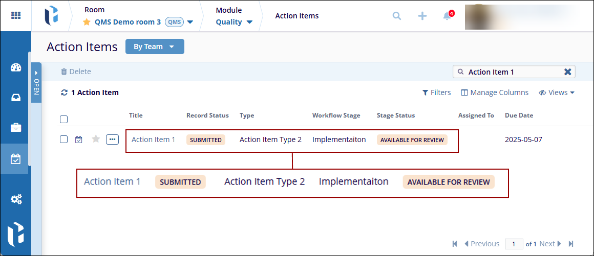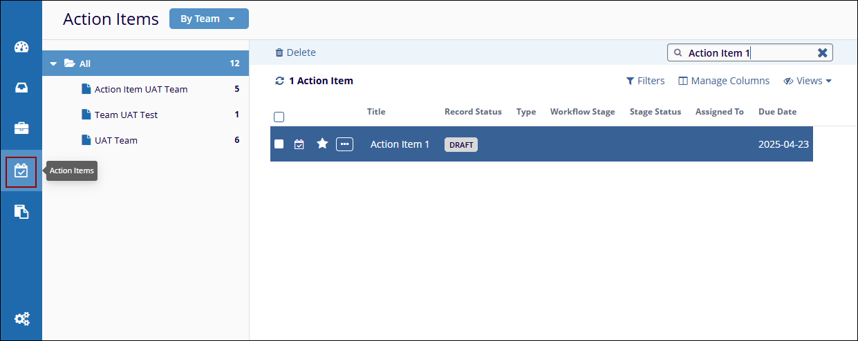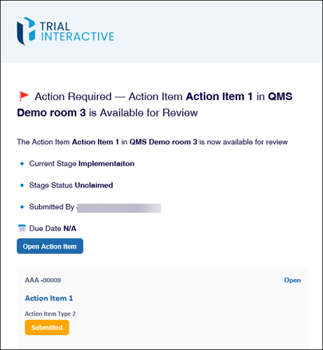 - Once the Action Item is successfully transitioned to the first stage of the workflow.