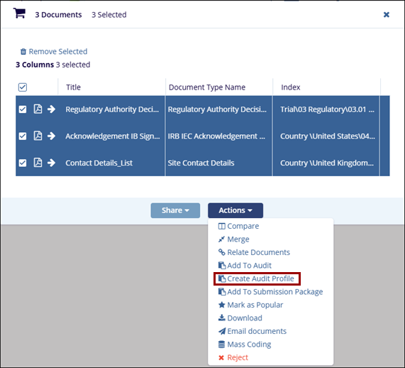 Admins can add documents to the cart from the grid and create audit profiles using the Create Audit Profile option.