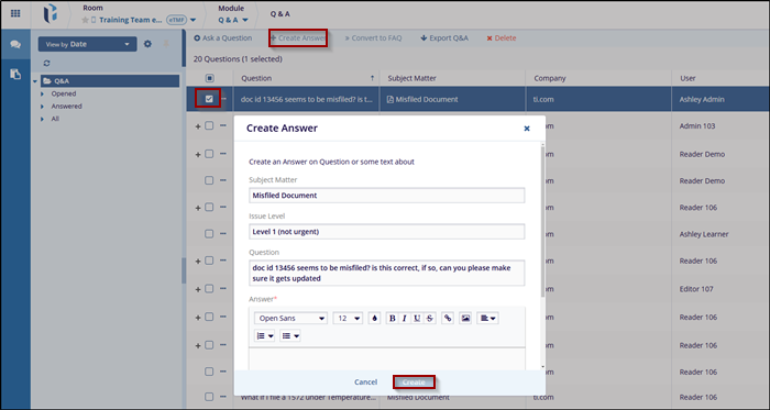 Administrator users and those users indicated as Subject Matter Experts may create answers to questions in the Q&A module.