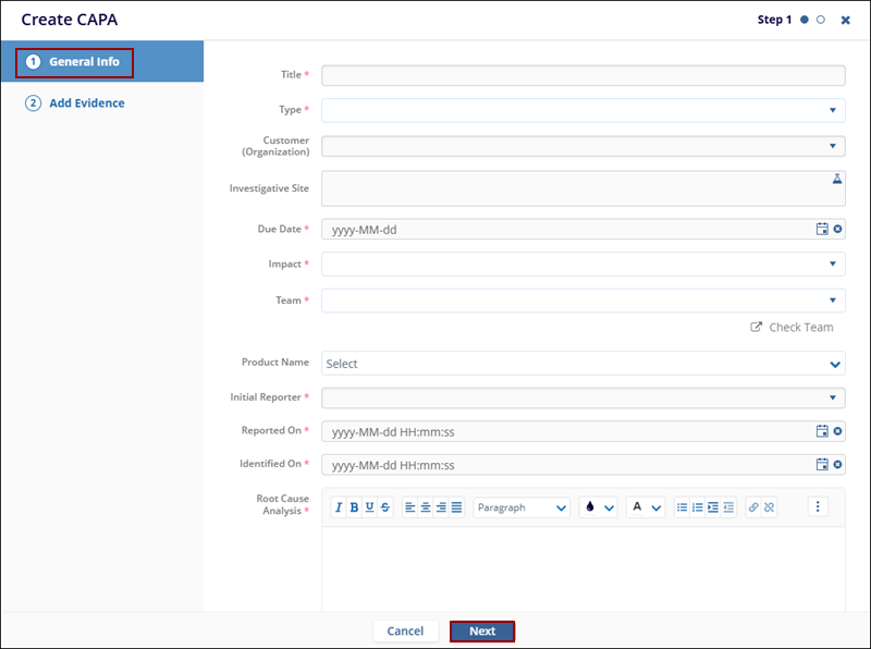 - On the Create CAPA form, fill in the mandatory details within Step 1: General Info and