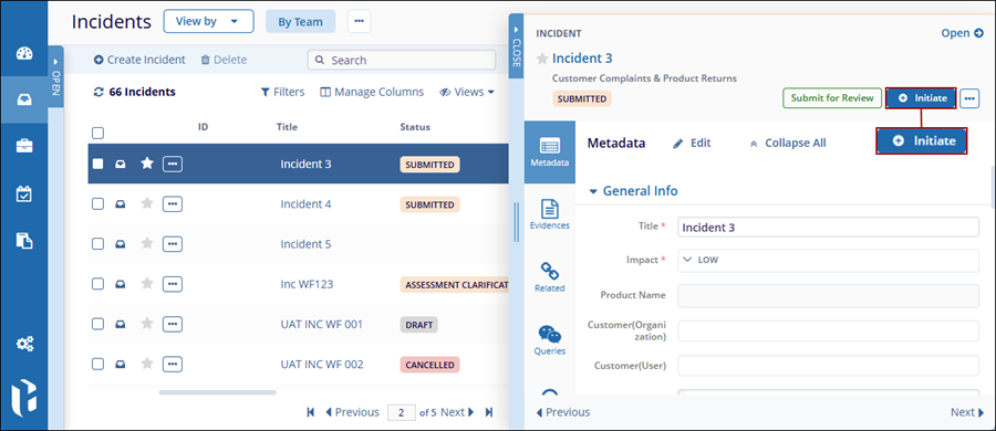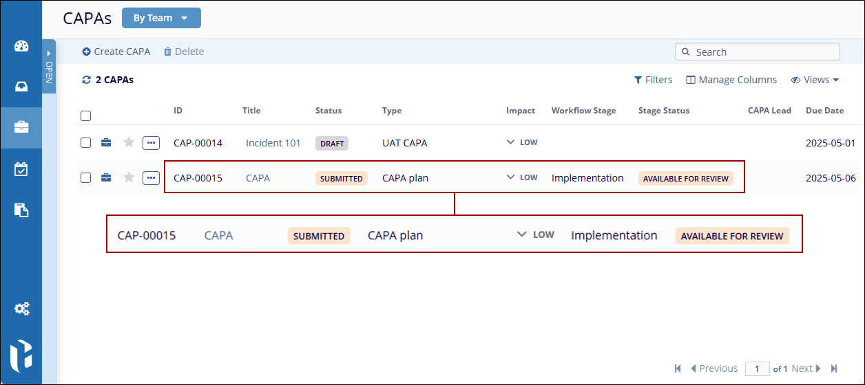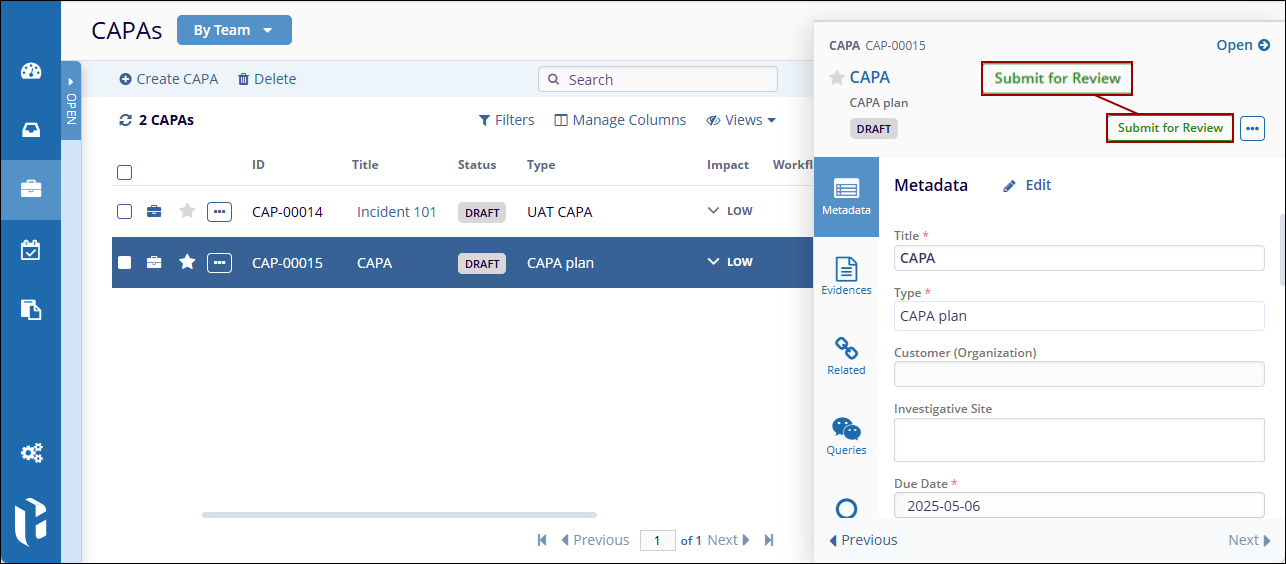 - Click on the CAPA title and click on the Submit for Review from the metadata