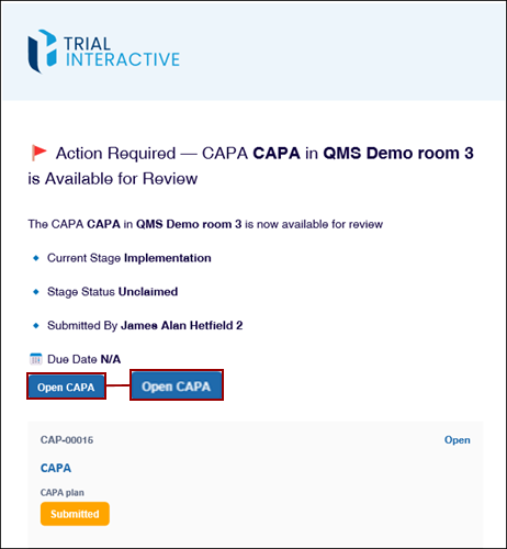 receives an email notification about the CAPA record with CAPA details and a clickable Open