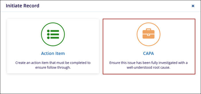 In addition to creating a CAPA record through the CAPA's modal, originator users can create a CAPA through an incident.