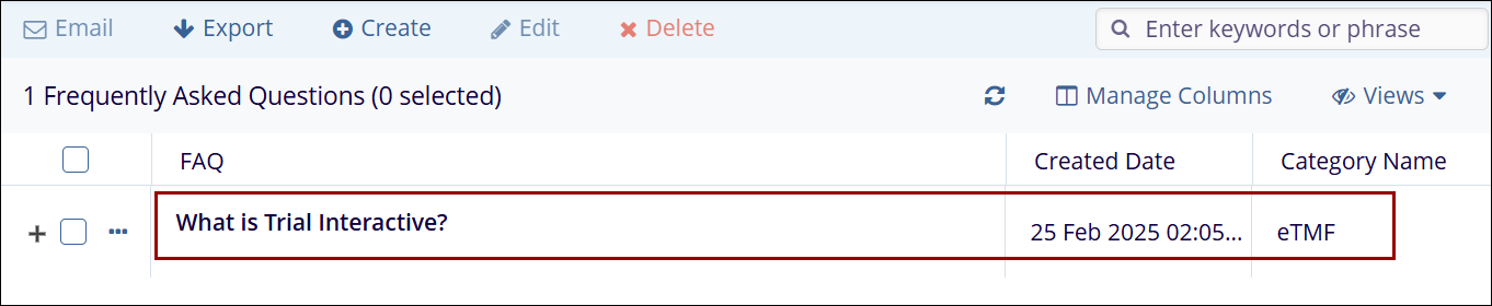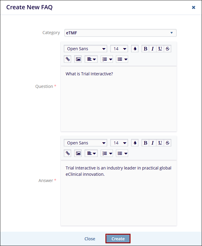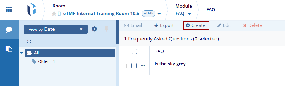 - Within the FAQ module, click on the +Create button from the top menu bar.