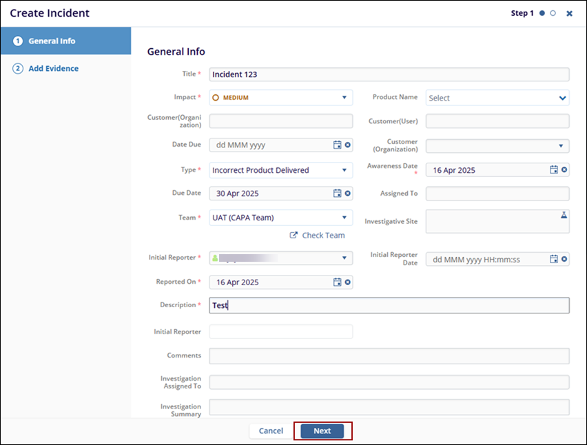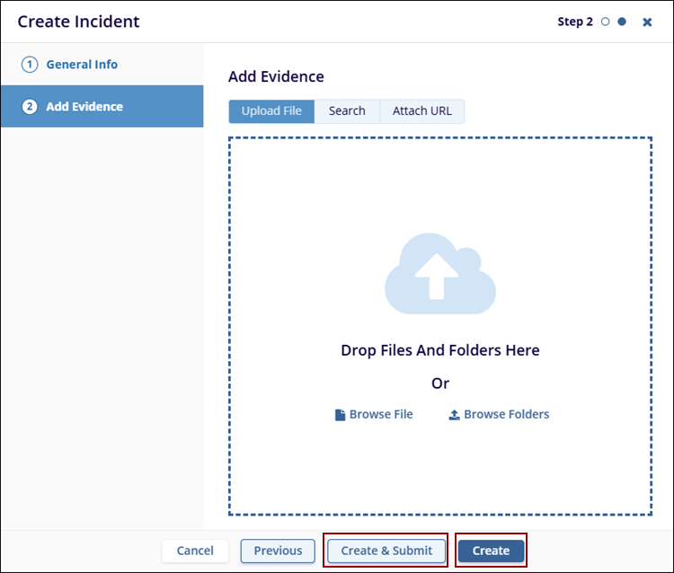 Note: To directly submit the Incident after creation, click Create & Submit. This will bypass the intermediate steps. To continue from the submission step, click here to navigate to the Incident Submission section.