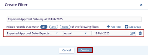 - The Create Filter pop-up window is displayed.