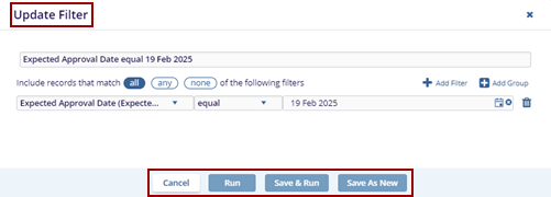- Run – This filter will be replaced in the current view without saving. The user must save the view separately by clicking on save view.