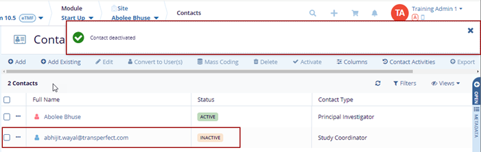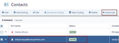 - The Deactivate Contact pop-up window is displayed with Cancel and Deactivate buttons.