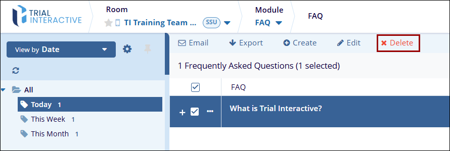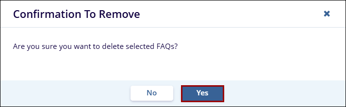 Delete FAQs To delete FAQs, follow the steps below. Select a FAQ from the available list and click on the Delete button from the top menu bar. Click on the Yes button on the confirmation popup.
