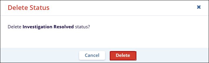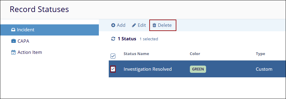 Note: Users are not allowed to edit ‘System Statuses’. When a system record status is selected, the Delete button is disabled.