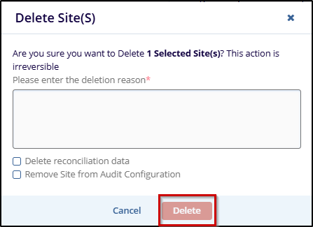 On the Delete Site(s) dialog, enter the reason for deletion in the provided field. Optionally, select Delete reconciliation data or Remove Site from Audit Configuration if applicable.