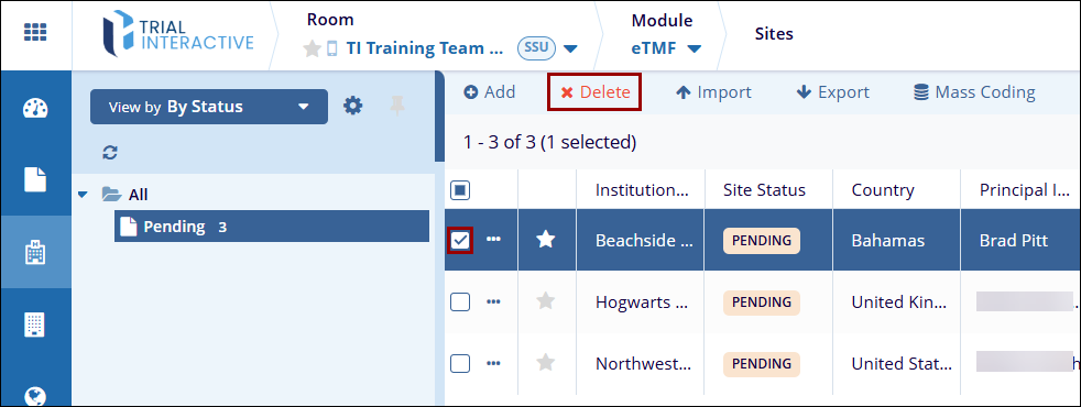 - On the Sites screen, check the box next to the site to delete,