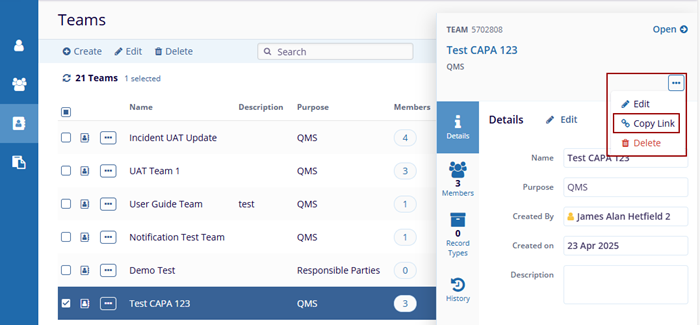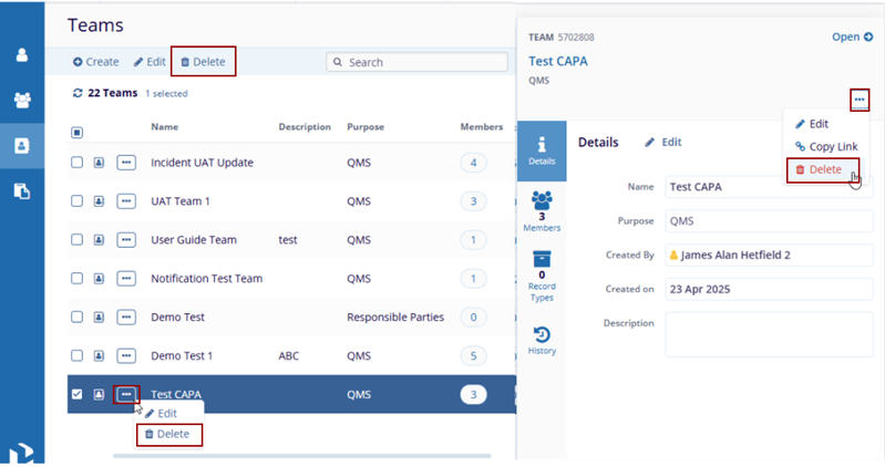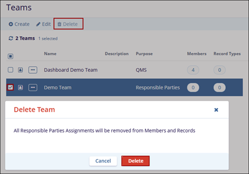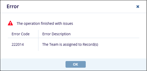 Important: When a team is associated with specific record types that are also associated with QMS Approval Workflow, users cannot delete the team, and upon a deletion attempt, the following popup is displayed.