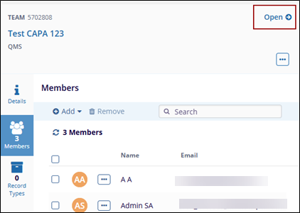 - Click the Open Arrow, and the user navigates to the Teams Details page.