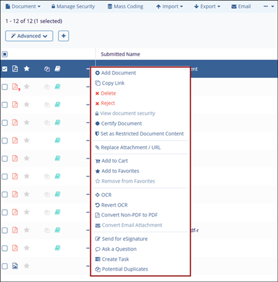 The Document Activities Menu provides access to various actions based on the user’s access rights. To open this menu, select a document or placeholder from the Grid and either right-click or click on the three-dot menu.