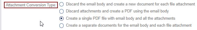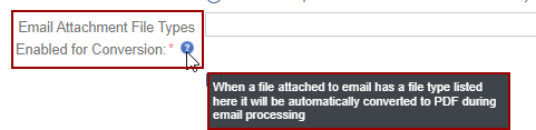 - The "Email Attachment File Types Enabled for Conversion" option, when enabled,