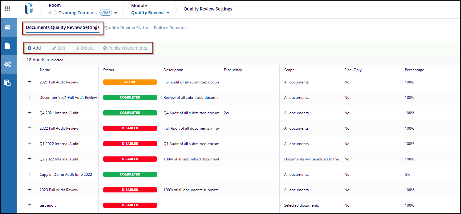 The Documents Quality Review Setting allows users to configure and manage the quality review process for study-related documents. It is designed to ensure that all documents adhere to the required standards of accuracy, completeness, and regulatory compliance. In this section, the user can add new documents for quality review, edit previously added documents, and Publish documents.