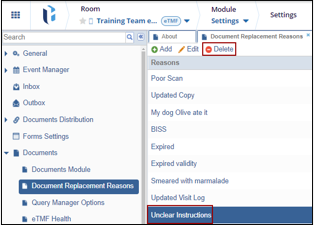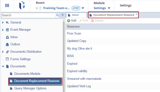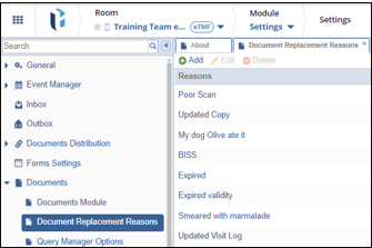 - Navigate to Navigation Grid->Settings -> Documents -> Document Replacement Reasons.