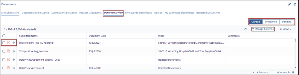 This tab displays the documents in a grid column with a selection tab for – Unread, Unclaimed, and Pending.