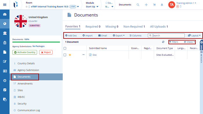 The Documents tab on the Country Details page assists the user in Importing, Adding Docs, Email, Exporting, Manage Columns, Search, Views, and creating Filters.