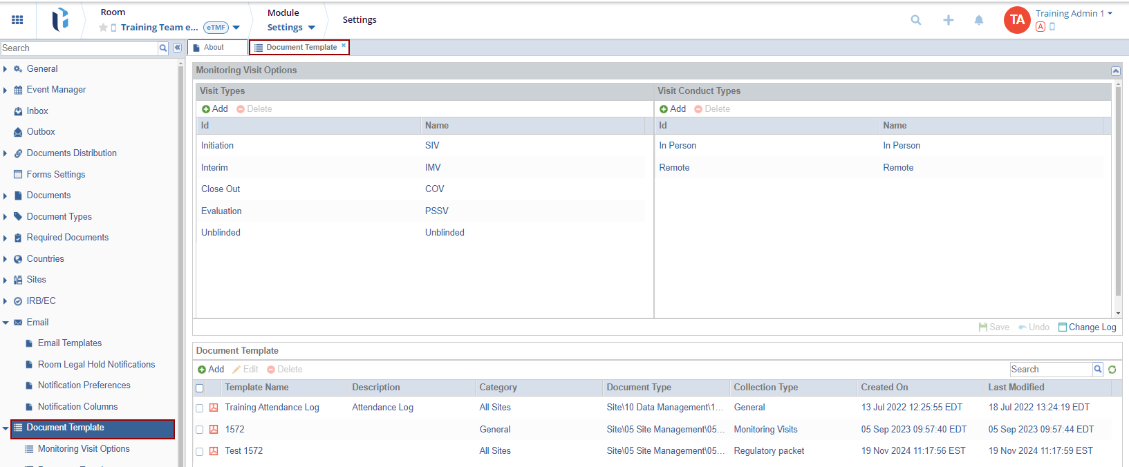 In the Document Templates settings, Administrator users can add, edit, and delete document templates.