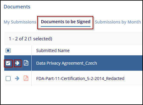 In the Documents section, select Documents to be Signed from the options at the top. This view will display a list of documents awaiting signatures, along with details like the document’s submitted name and current signer status.