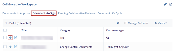 To access the document for signature, select the document and click on the arrow to open the document signature interface, which utilizes the implemented signature engine (TI Sign, Adobe Sign, etc.)