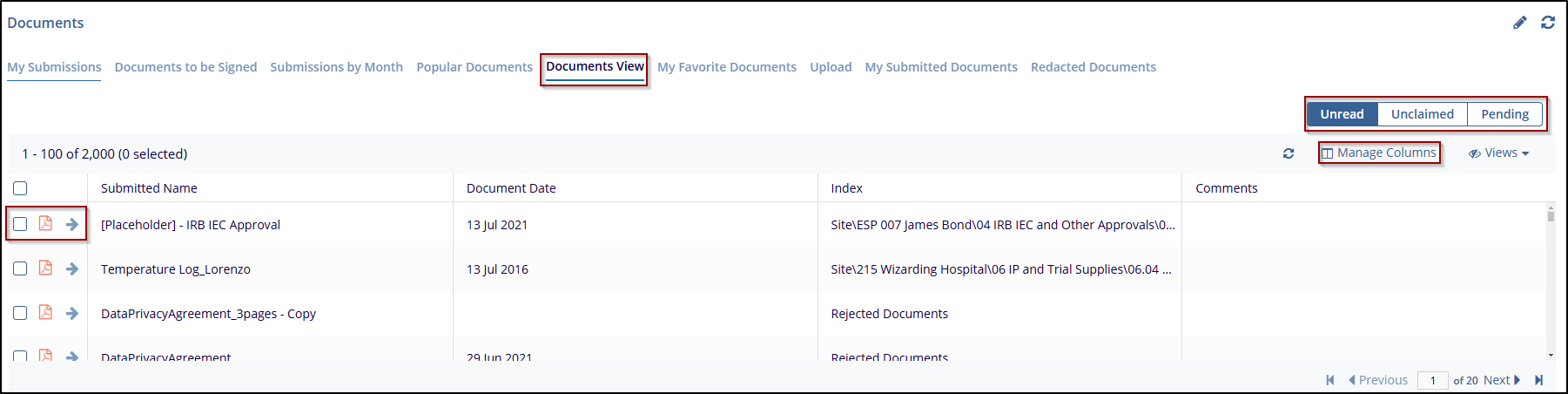 The Documents View tab displays the documents in a grid column with a selection tab for – Unread, Unclaimed, and Pending.