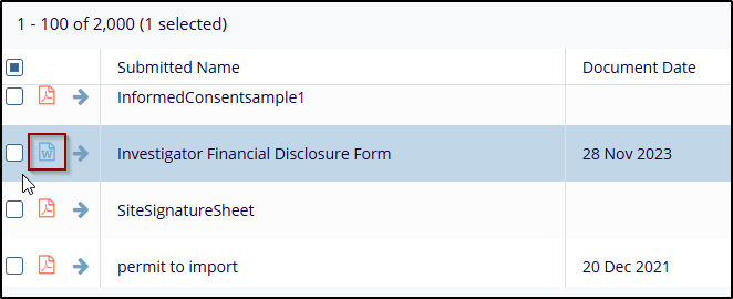 - Select the required and appropriate checkboxes from the Submitted name option to select the document, next to the checkboxes, the user can click on the blue arrow (Go to the document), which will navigate to the document index.