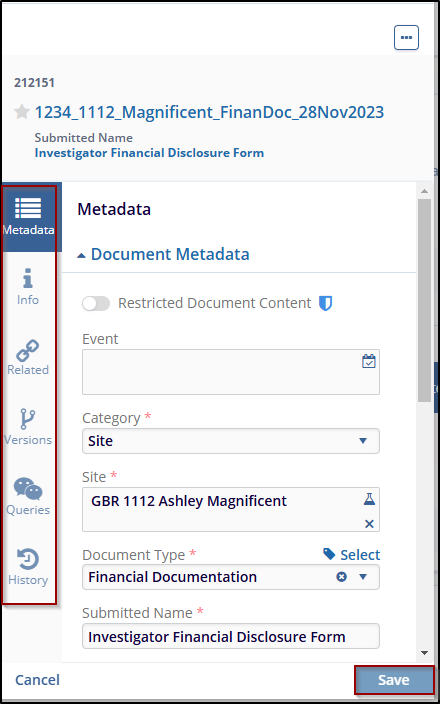 - Within the Metadata panel, access the Info, related, version, queries, and history