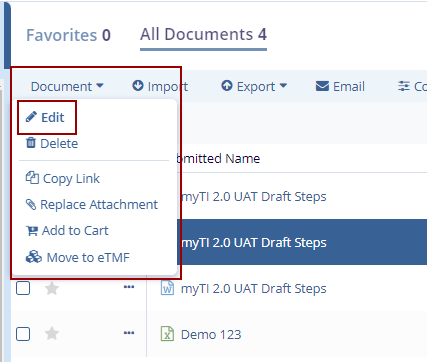 - Click the dropdown menu of the Document button OR click the three-dot menu next to the checkbox of the selected document.