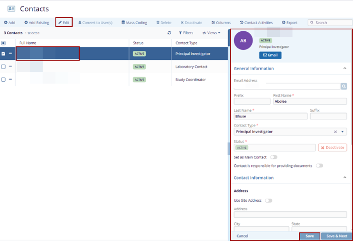 - Select a contact and click the Edit button in the menu bar to open the Contact Profile in the metadata panel on the right side of the screen.