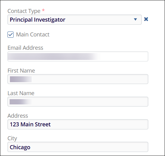 - Main Contact: Check or uncheck the Main Contact checkbox to designate the contact as a main contact. If selected, the Main Contact column in the contacts screen will display Yes and vice versa.