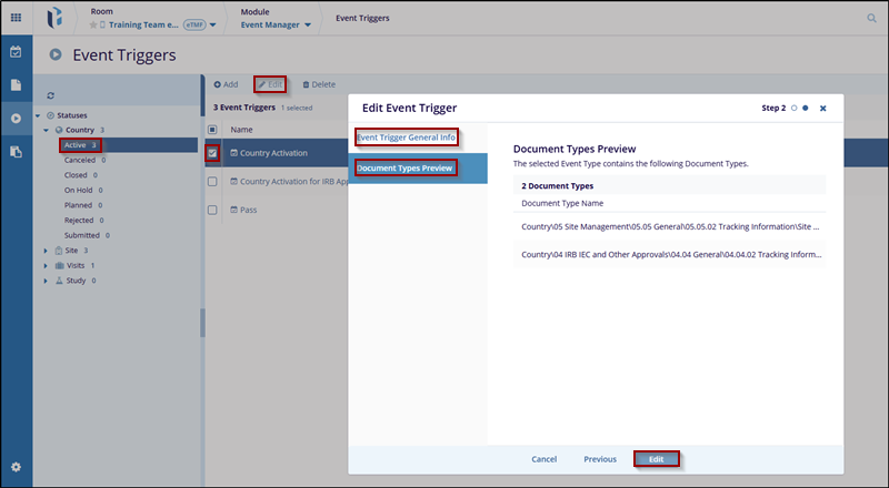 The Edit button in the Event Trigger allows user to edit the event type and the selected status.