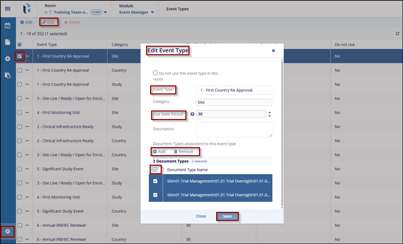 - In the Edit Event Type window, you can modify details like Due Date Period and associated Document Types: