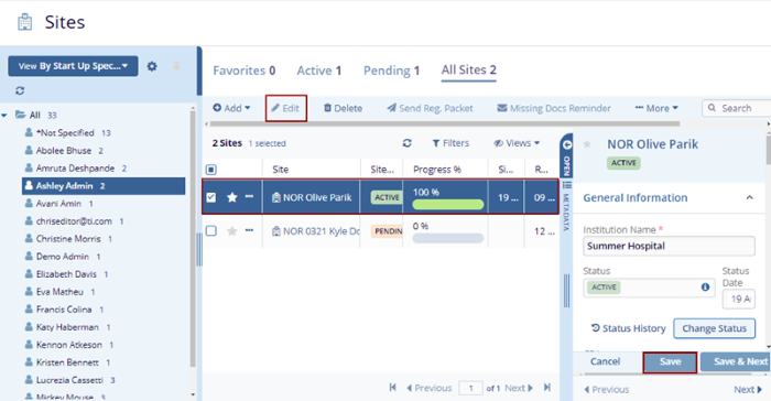 - Make edits to the site details and click on the Save button. The changes get saved.
