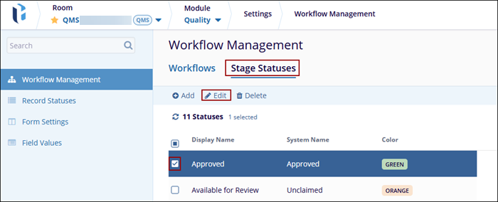 - Select a stage status within the Stage Statuses tab and click on the Edit
