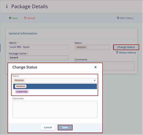 - Click the Change Status button displayed on the Package Details page. This opens the Change Status popup window.