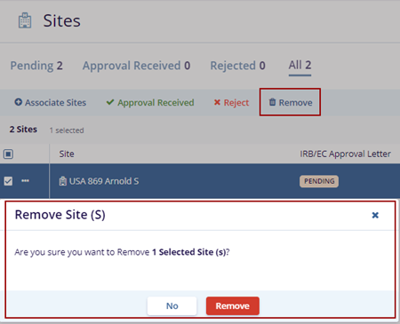 Site (s) pop-up window is displayed with the No and Remove buttons.
