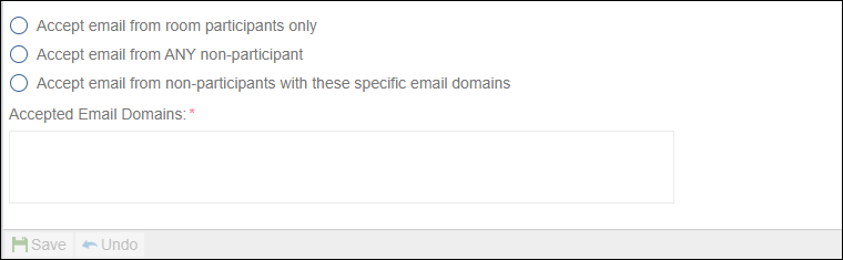 - Accept email from room participants only: This option, when enabled, indicates that emails from non-room-users will not be accepted.